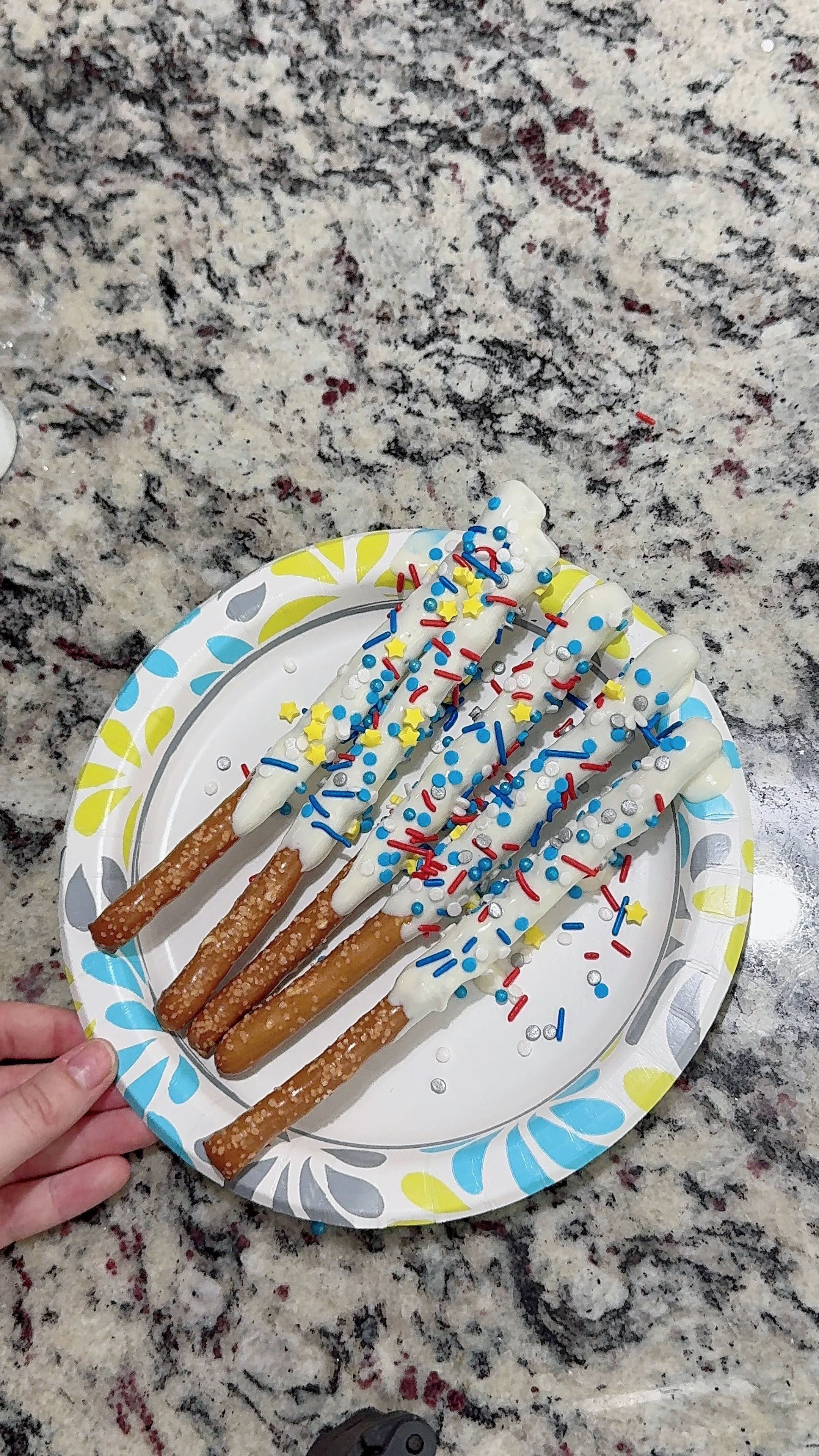 Step 3: Add the sparkle: While the chocolate is still wet, sprinkle your red, white, and blue decorations generously. You can roll them or just hold them over a plate and sprinkle to your heart’s content.