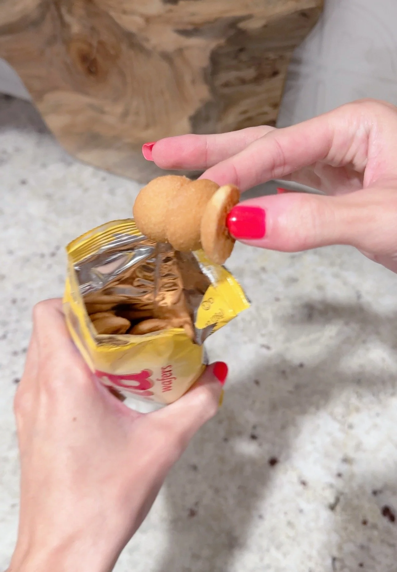 First, open your pack of mini nilla wafers. Take a couple out and set them to the side, these will come in handy later.