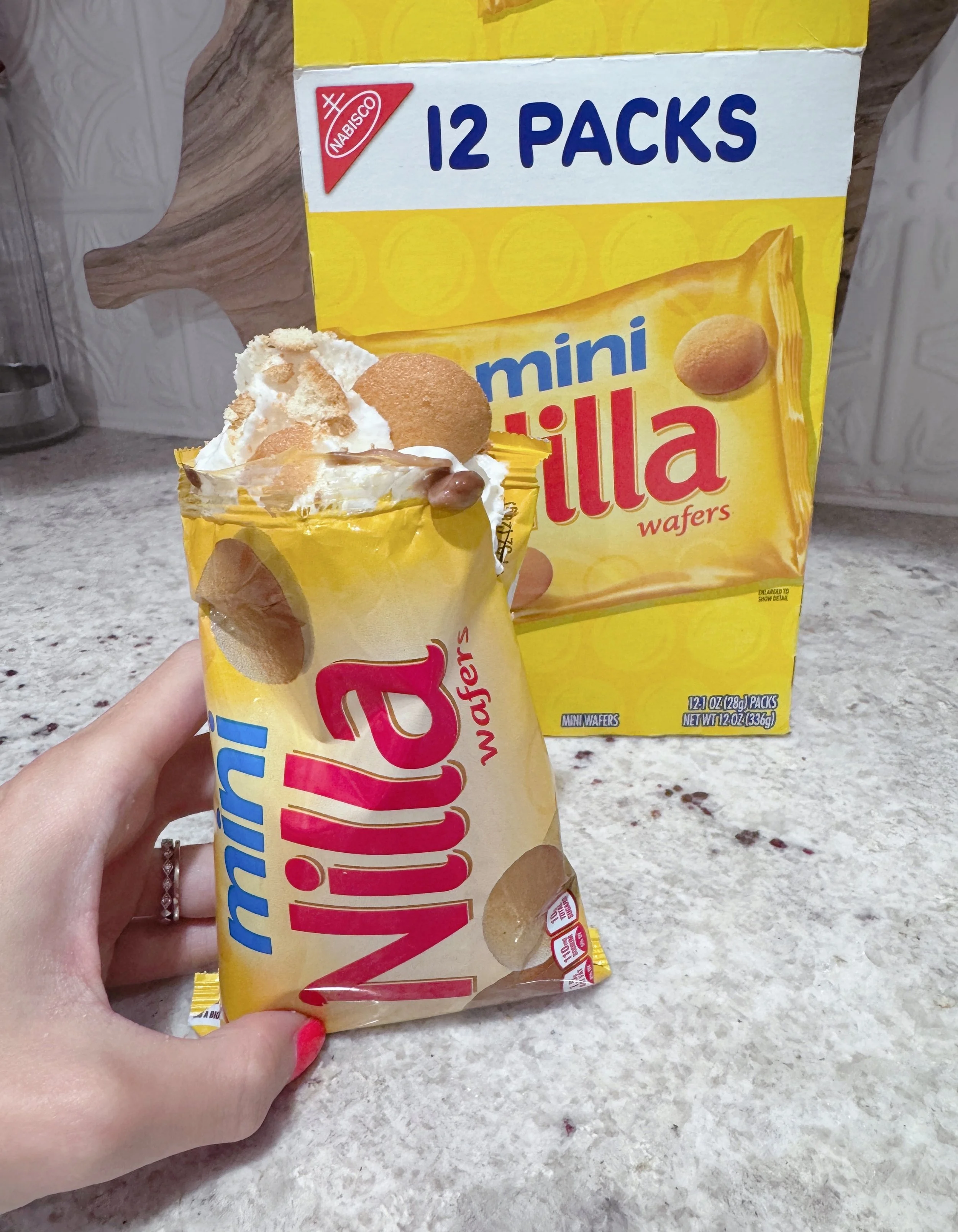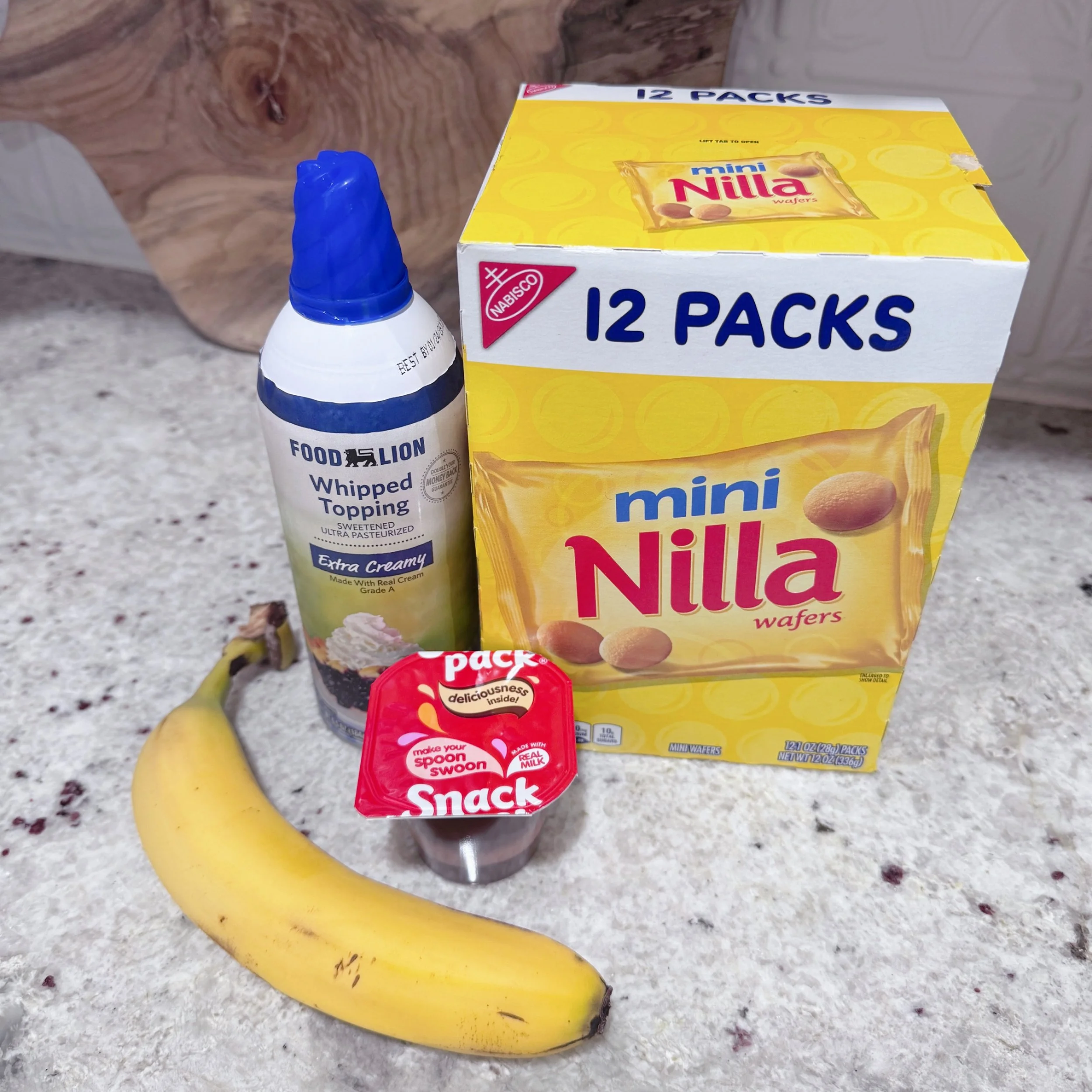 All you need to make it is 4 ingredients: Mini Nilla Wafer Packs, Pudding, Bananas, and Whip Cream!