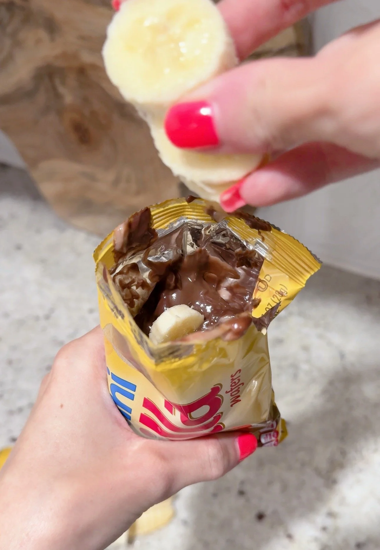 Next, add your choice of pudding to the mini wafer packet. I used chocolate and vanilla swirl, but if you prefer a more traditional banana pudding flavor, use vanilla. It’s whatever you like!