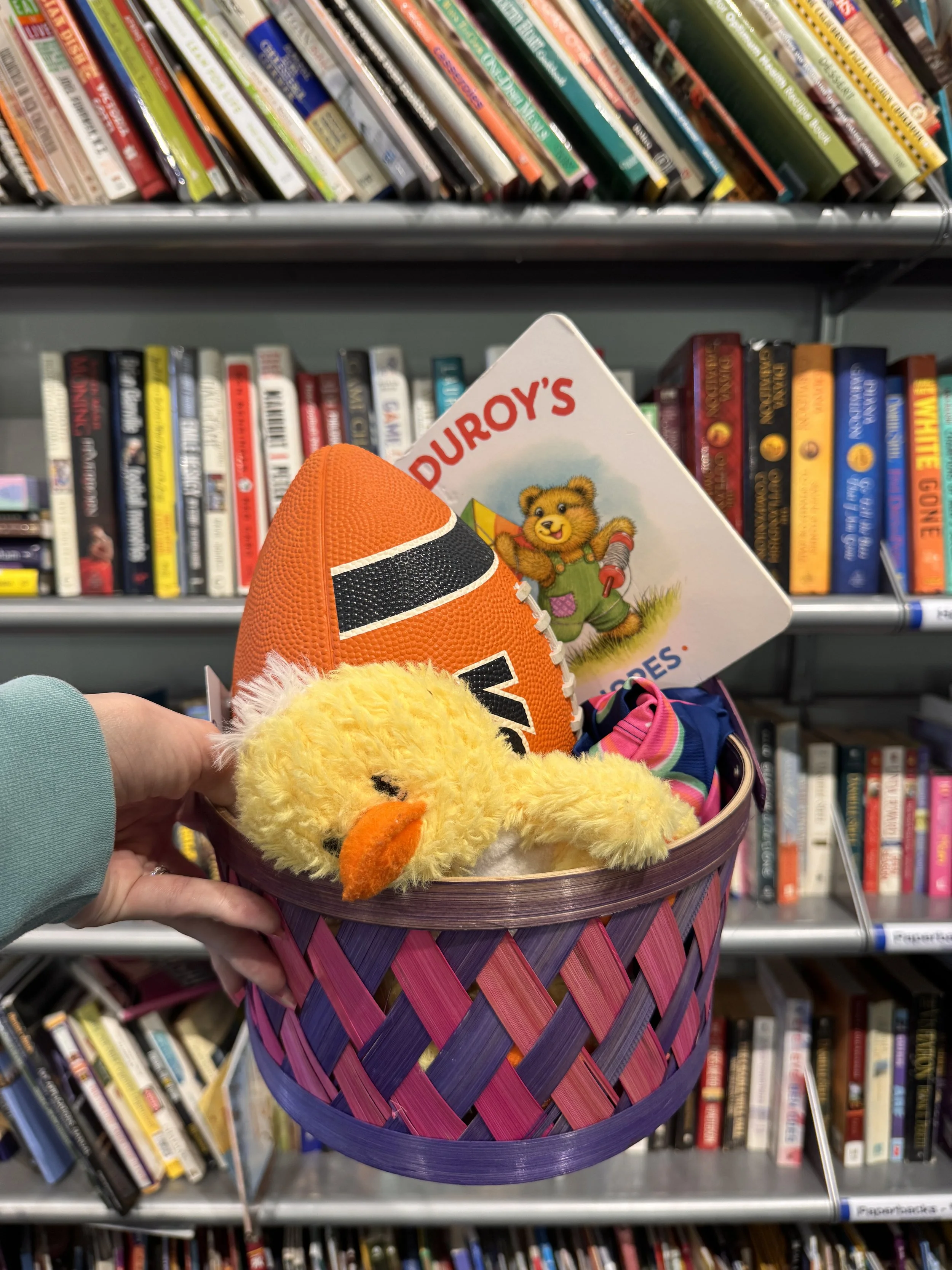 A book, of course! Rows and rows of books lined the exterior wall of this Goodwill. Choose one that fits your recipients age and interests and add it to the basket! Most children’s books are priced at $0.99!
