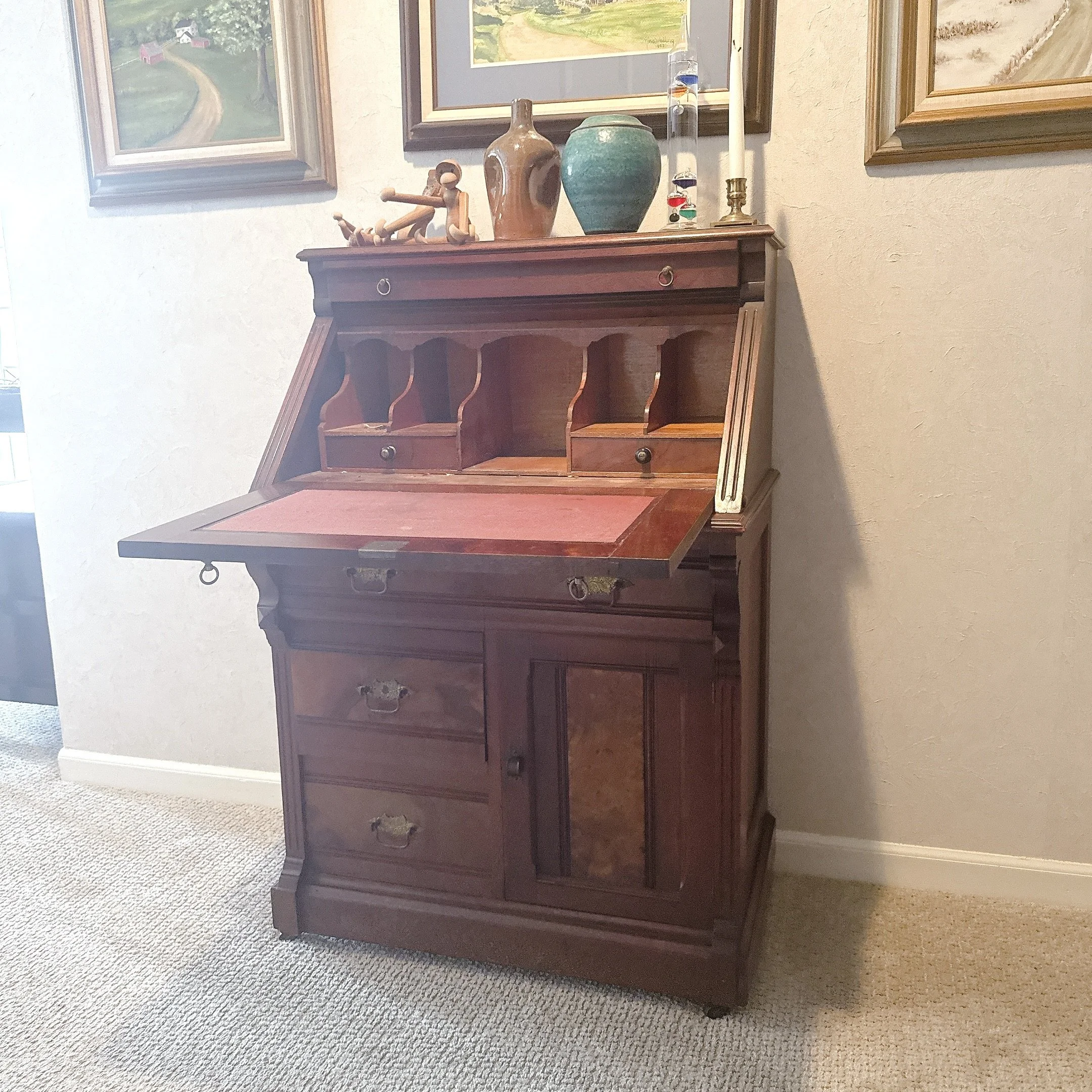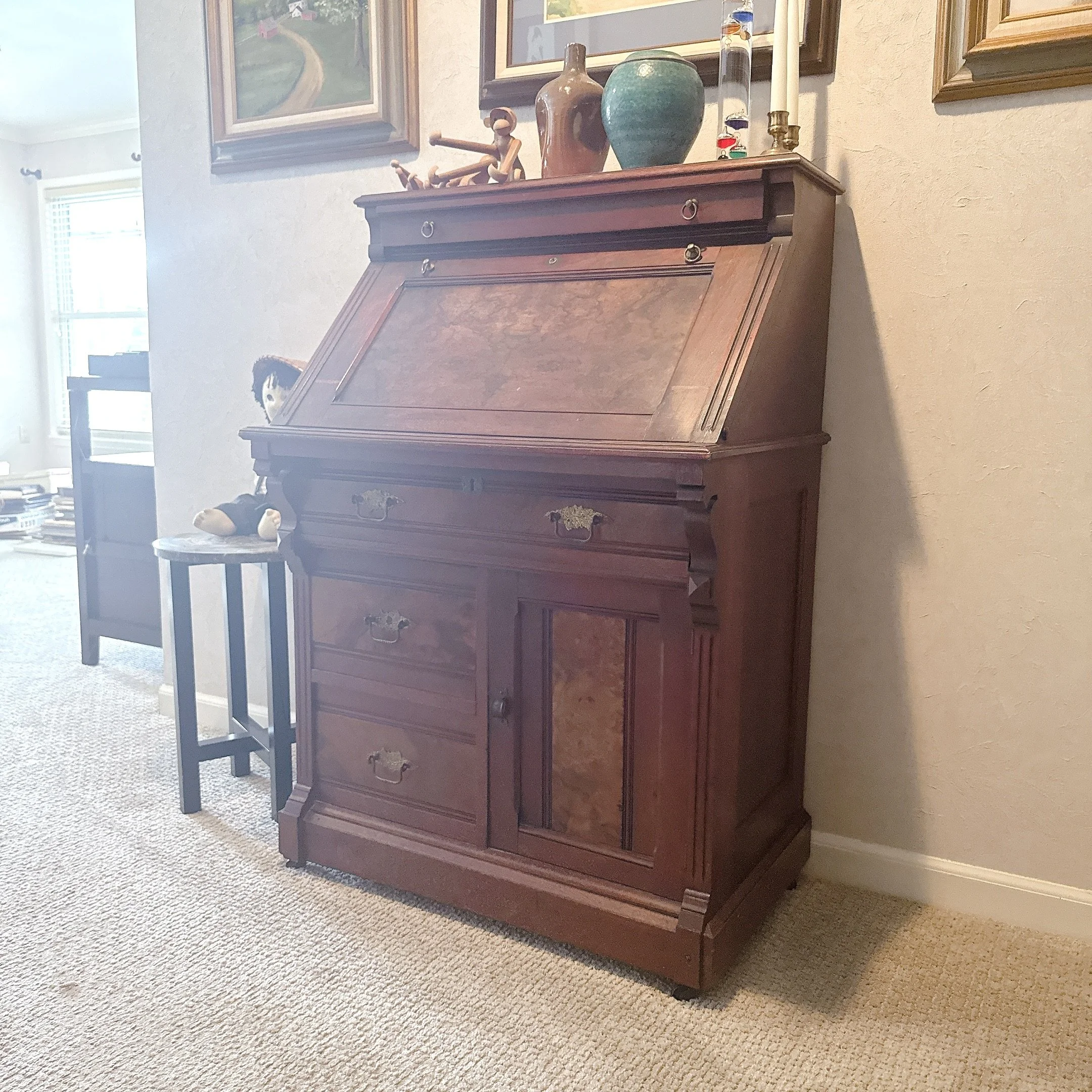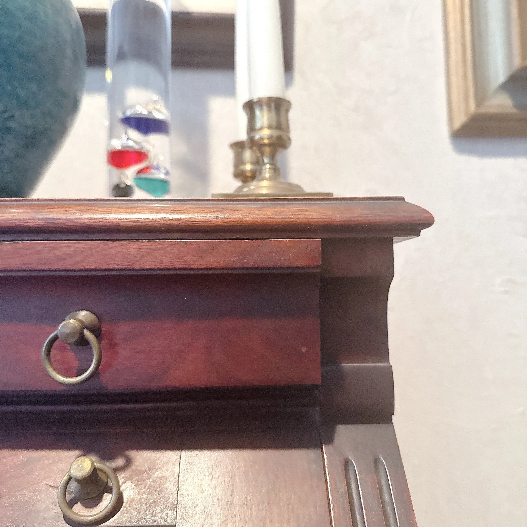 Sturdy. Some wear is present, see photos. Drawers open and close easily. The drop leaf desk opens and closes easily. We have the key for it.