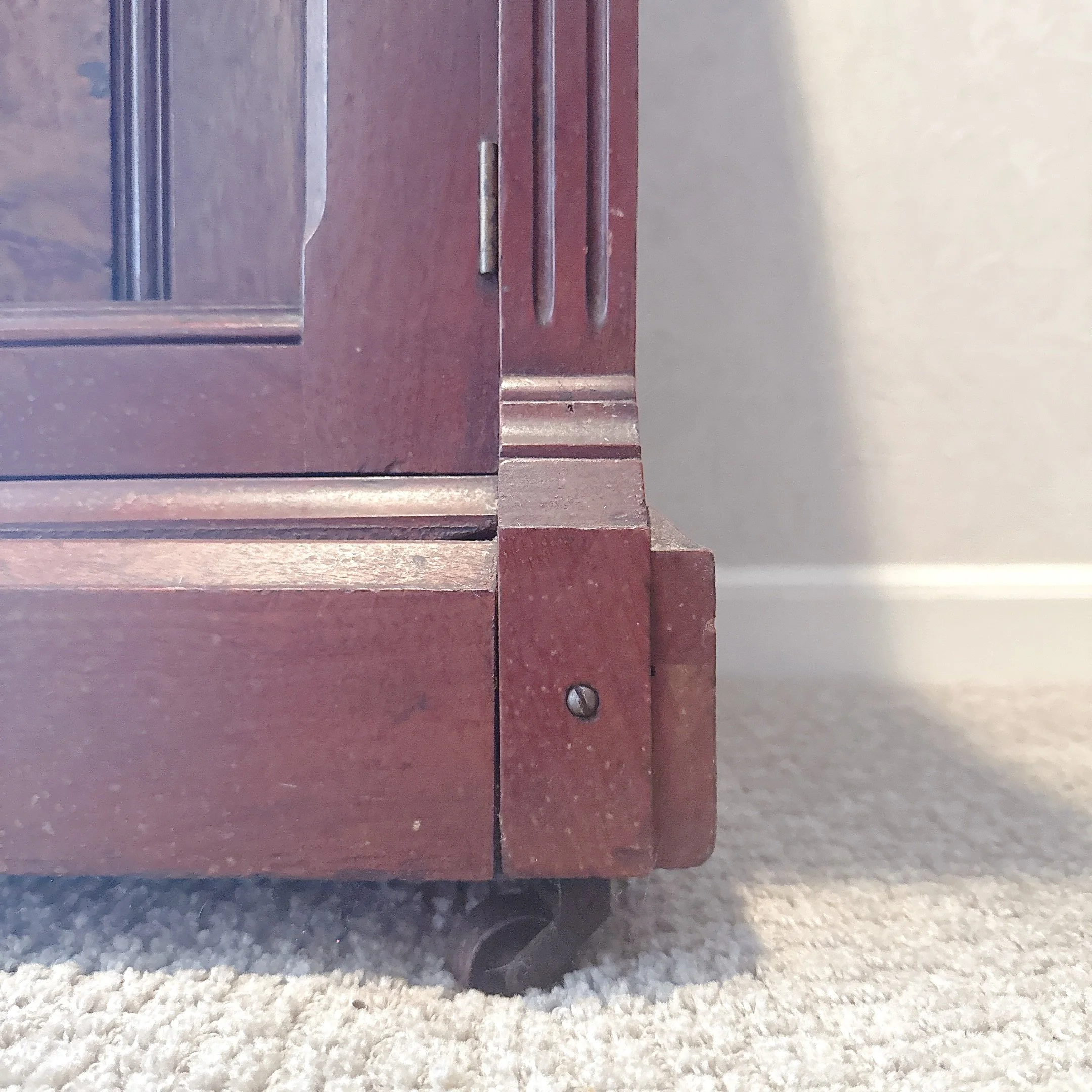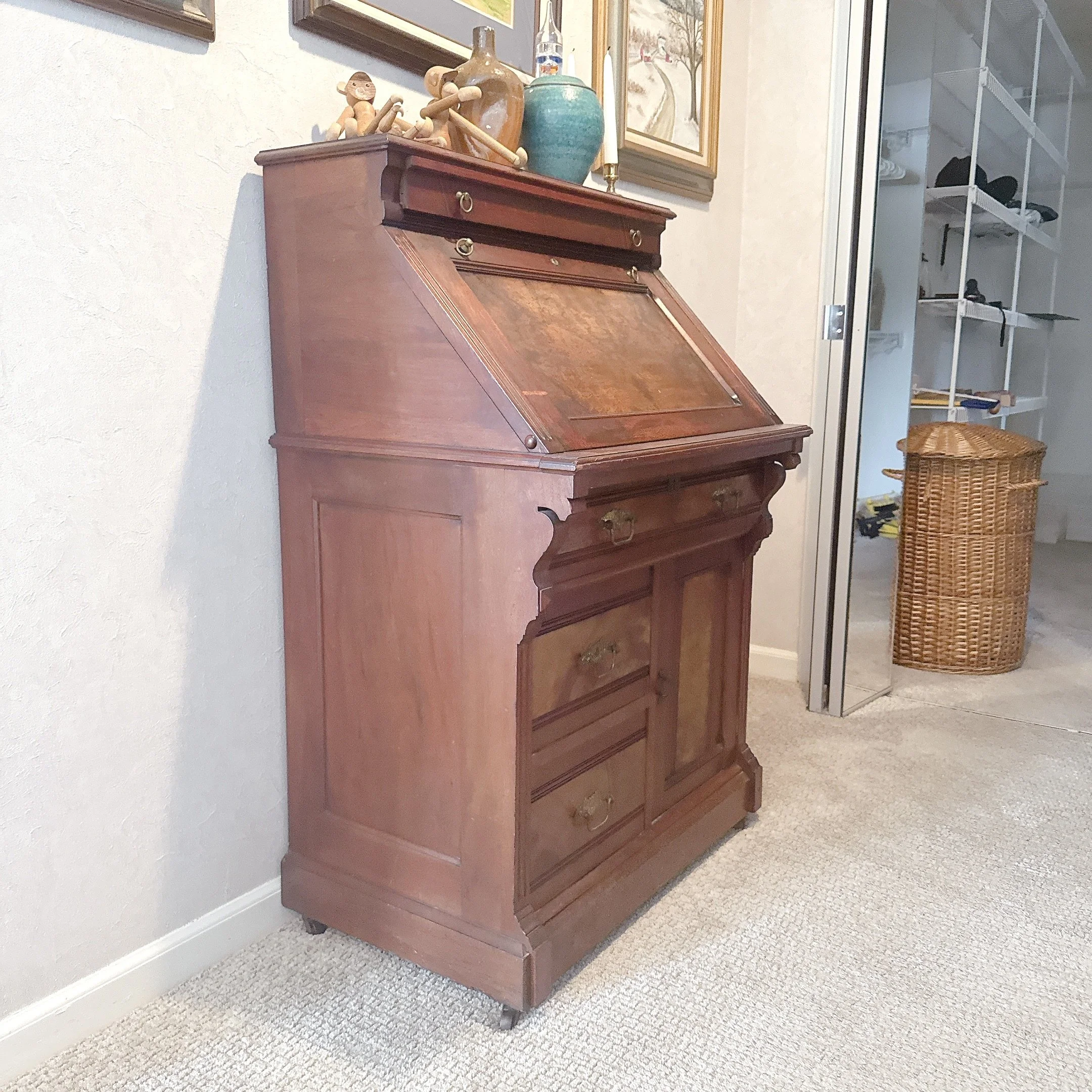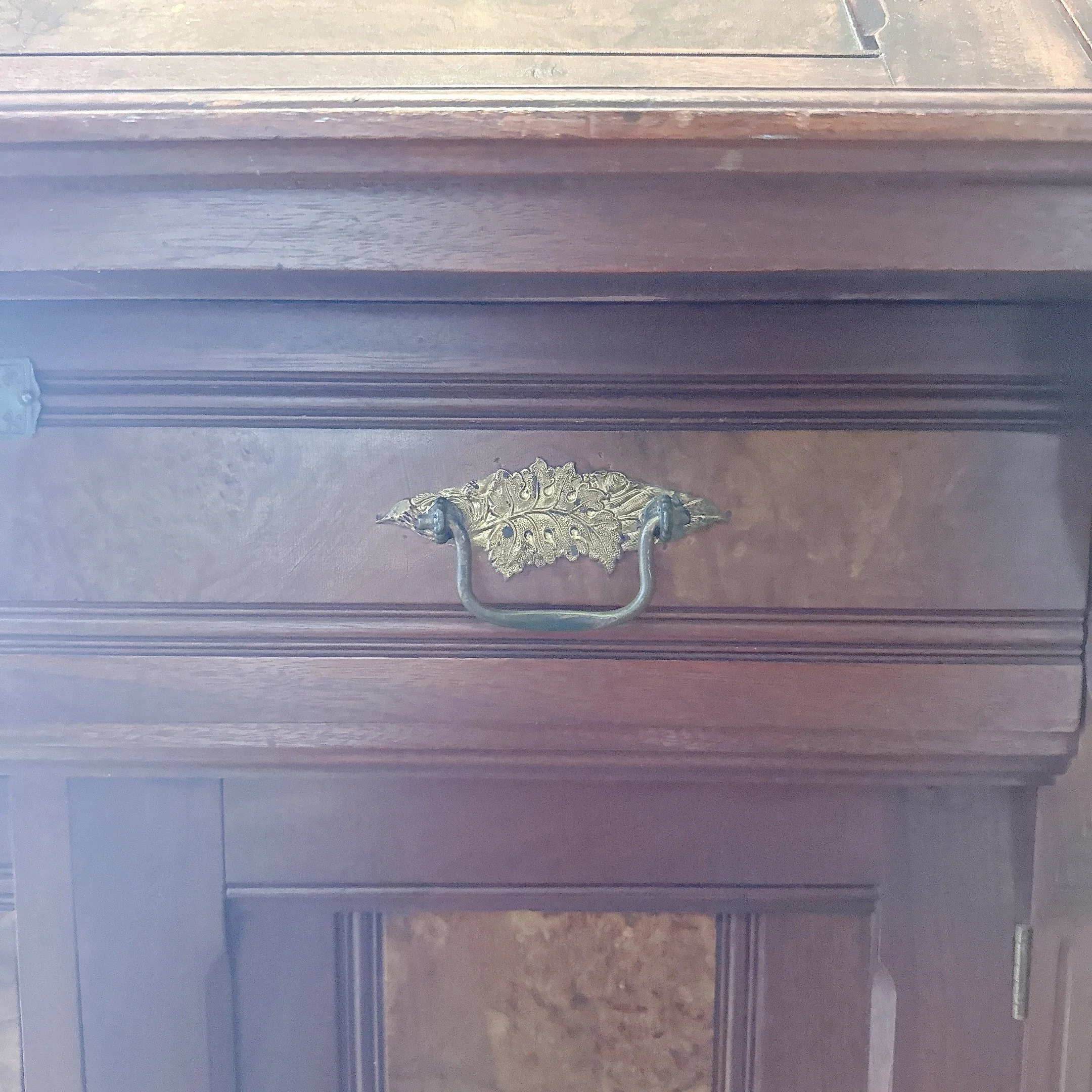 Sturdy. Some wear is present, see photos. Drawers open and close easily. The drop leaf desk opens and closes easily. We have the key for it.