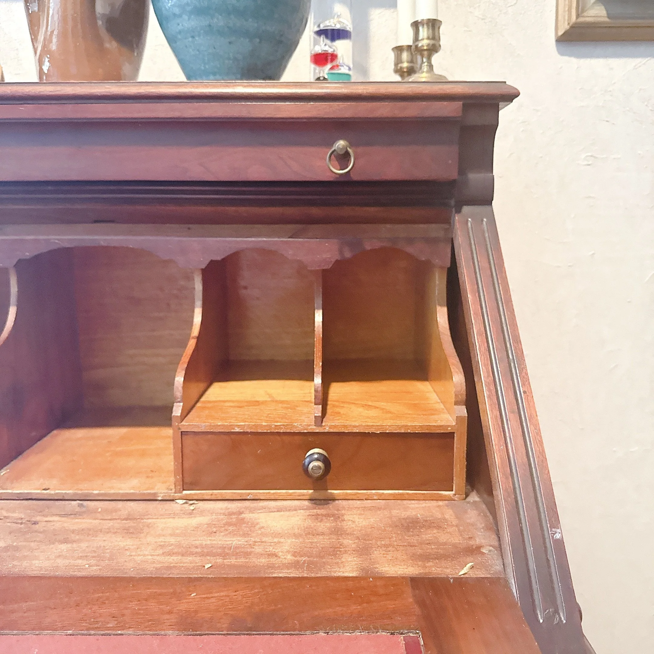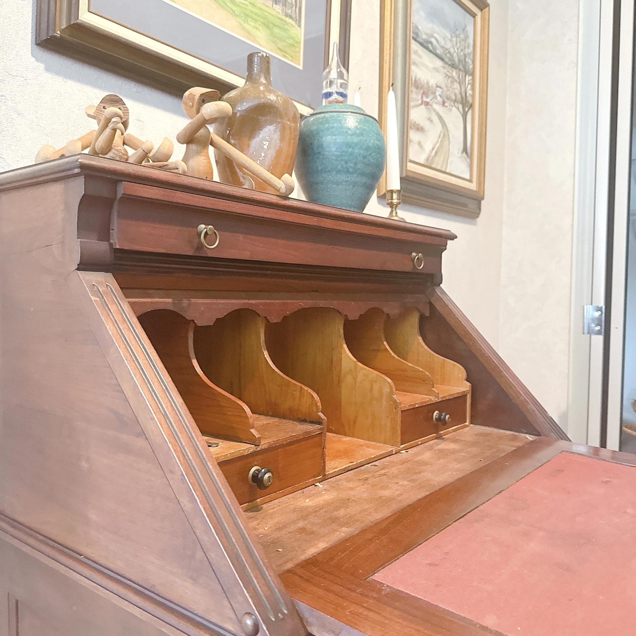 ANTIQUE MADDOX TABLES RED MAHOGANY CHIPPENDALE STYLE SECRETARY DESK - BALL & CLAW FEET- BRASS PULLS